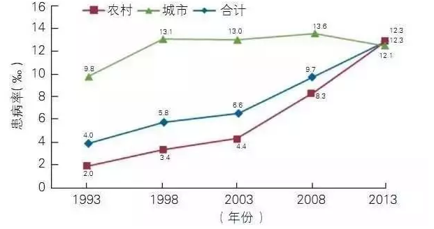 2017年6月,《中國心血管病報告2016》發(fā)布,報告概要刊登于中國循環(huán)雜志。國家衛(wèi)生服務(wù)調(diào)查結(jié)果顯示,1993~2013年期間,我國腦血管病患病率整體呈上升趨勢,以前是城市高于農(nóng)村,但目前已經(jīng)發(fā)生逆轉(zhuǎn)。2013年的第五次調(diào)查顯示,城市腦血管病患病率(12.1‰)有所下降,農(nóng)村(12.3‰)仍呈明顯的上升。腦卒中現(xiàn)患人數(shù)約1300萬,腦卒中給中國造成的經(jīng)濟負擔每年高達400億元。