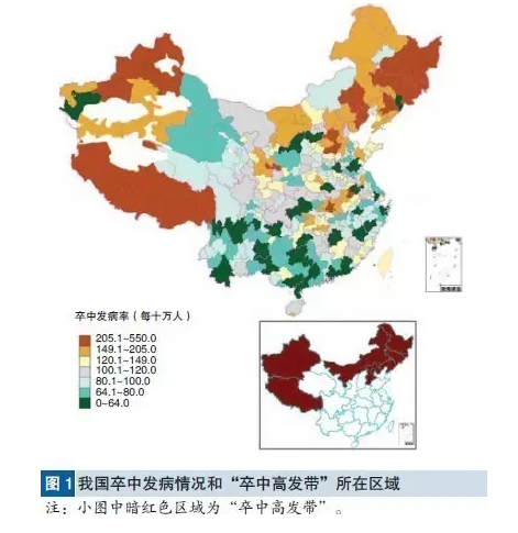 中國卒中帶 研究顯示,中國西北部九省市或自治區(qū)(黑龍江、西藏自治區(qū)、吉林、遼寧、新疆維吾爾自治區(qū)、河北、內(nèi)蒙古自治區(qū)、北京及寧夏回族自治區(qū))的卒中發(fā)病率較高,構(gòu)成中國卒中帶。卒中帶的卒中發(fā)病率為236.2/10萬,顯著高于卒中帶之外地區(qū)的發(fā)病率109.7/10萬。